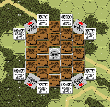The Fortified Areas described in GSR-1 consist of the following from the Fortification BVP Table (H1.6): A total of (4) 1-5-7 gray Pillboxes, (18) trenches, (8) wire and (1) 3-5 all around blockhouse. The following layout must be placed and must match the board location on the MASL map (meaning it cannot be randomly placed).