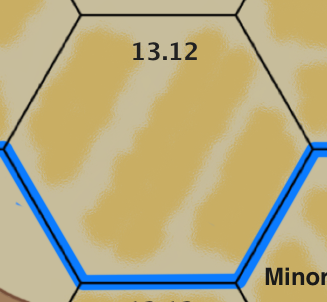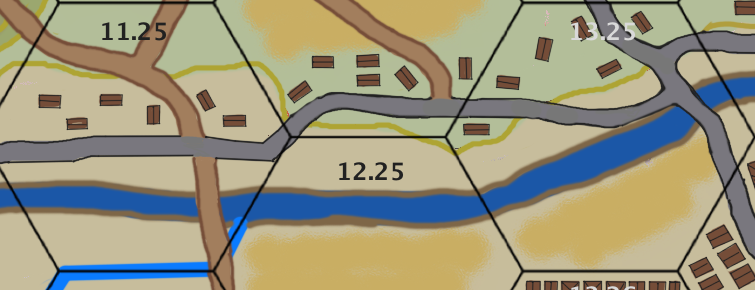 Example: A wooden bridge exists in hex 11.25 because a dirt road crosses the river. A stone bridge exists in hex 13.25 because a paved road crosses the river.