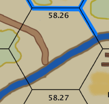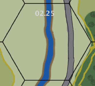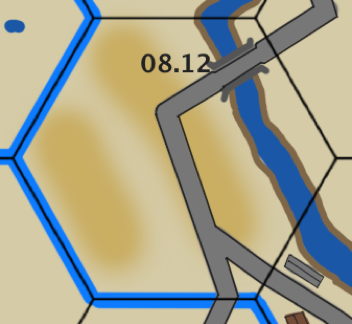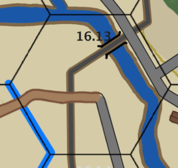 If the attacker is entering hex 15.05 from 14.05 he is penalized by the river going down the hex spine, by having the scenario board set being three boards instead of four. In this case the attacker must enter/setup south of the river between the road on the left hand side of the River board and the southern side of the river itself. This forms a very restricted area as indicated by the TOCS art depiction, and a poor choice for a river crossing.