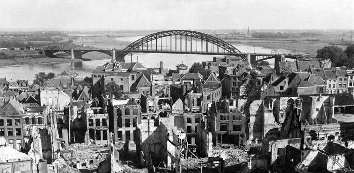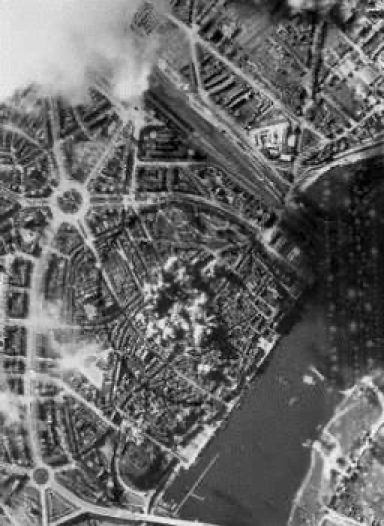 The city of Nijmegen as seen from aerial reconnaissance in 1944, including the rotary (round-about). The RR Bridge in the top of the aerial photograph is obscured and the highway bridge can barely be seen in the bottom.