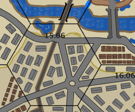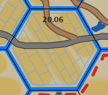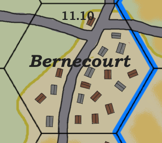 If the attacker is entering hex 15.05 from 15.06. The scenario board set for hex 15.05 will has an Open board (top), then an Open board with the X30 Fort Lent overlay located in the center of the board (defenders choice of location), then a River board that has a single lane railroad bridge located where the road on the right-hand side of the river board abuts the river. A City board is added at the bottom as a fourth board because the river board in 15.05 is not centered. When the City board is rolled, keep rolling until a city board with at least one hill because of the crest line between the City board and the river board indicates that the City is a hill. This is a special case because the City board became part of the (hex 15.05) scenario battle due to the direction of the attack. The pond in 15.06 is ignored and can be considered an embellishment. Units located in hex 15.06 can freely setup on the City board and units in hex 15.05 can freely setup on the other three boards.